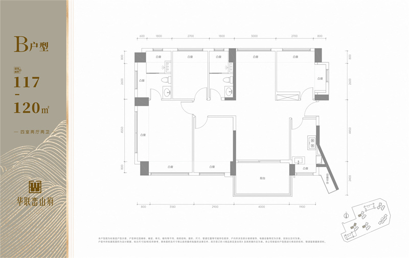 建面约117-120㎡ 奢适四房 多代同堂 各属天地 纵享天伦 南北通透 南向三开间 阳光肆意游走 约270°主卧景观 静享私属谧境